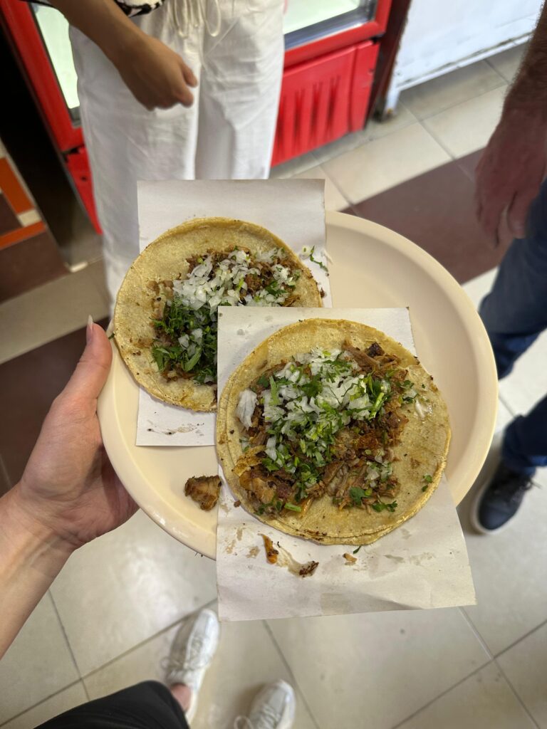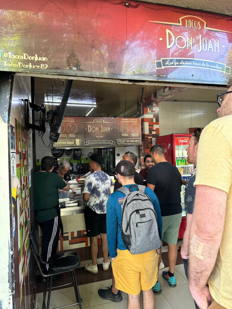 Tegen het einde van de fietstour werd een lunchstop gemaakt bij Tacos Don Juan. Zoals de naam al doet vermoeden, is dit een restaurant waar je overheerlijke taco’s kan eten. Geloof ons: deze taco’s leggen de lat hoog de rest van je verblijf in Mexico. Het restaurant is ook populair onder locals, wat vaak een goed teken is. Er zijn een paar zitplekken buiten waar je kunt genieten van de vers bereide taco’s en de levendige sfeer van de stad.