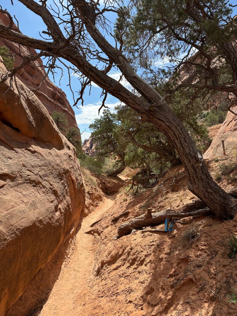 Hierna heb je de keuze om terug te keren of de hike af te maken via de Primitive Trail. Deze route wordt aangegeven met gestapelde stenen of lintjes aan de bomen en struiken.